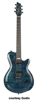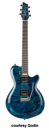 GODIN | ELECTRIC: LGX SERIES | The original LGX model featured both magnetic pickups and L.R. Baggs transducer saddles, and offered guitar players both the "electric voice" and the "acoustic voice" in the same instrument. A year later, the LGX-SA with Roland-Ready Synth Acess was introduced. The LGXT subsitutes a tremolo bridge for a tune-o-matic bridge/strings into-body; and the LGX3 features 3 single coils instead of the two humbuckers on the LGX-SA. | LGX (MODEL 7561) | - rounded single cutaway mahogany body, carved figured maple top, mahogany neck, 22-fret rosewood fingerboard with dot inlay, "Godin style" tuneomatic bridge/strings into-body "fingers," three-per-side tuners, gold hardware, two Godin Tetrad (twin blade) pickups, microtransducer bridge pickup, volume/tone/blend controls, five-way magnetic pickup selector switch, magnetic/mix/transducer mini-switch, volume/treble/mid/bass transducer controls (four sliders in bass bout), available in Black Pearl (10509), CognacBurst (10486), Mahogany (7578), Trans. Amber (7585), or Trans. Blue (7561) high gloss finish, 25.5 in. scale, mfg. 1996-2002. |