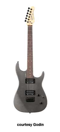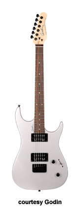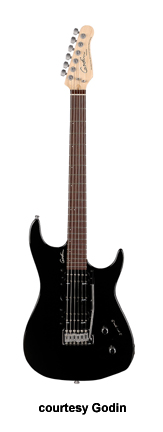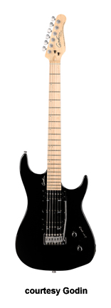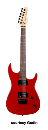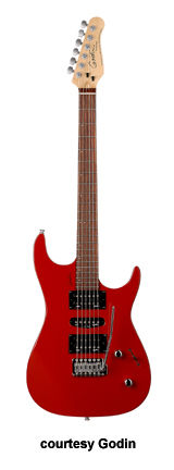 FREEWAY CLASSIC | - offset double cutaway Strat stylesilver leafmaplebody with poplar wings, 12 in. radius rock maple neck, 22-fret maple or rosewood fingerboard, three Godin designed pickups in HSH configuration, vintage tremolo bridge, six-on-one-side tuners, five-way switch, two knobs, chrome hardware, available in Black Pearl, Burgundy (disc.), or Red (2004-07) finish, 25.5 in. scale, mfg. 2004-present. |