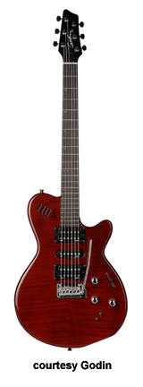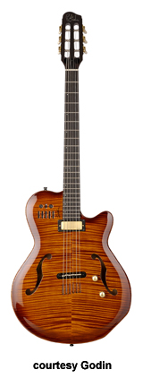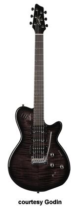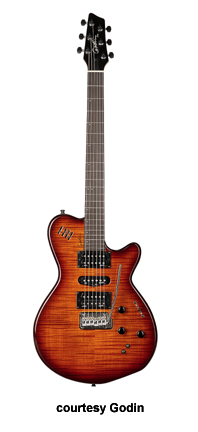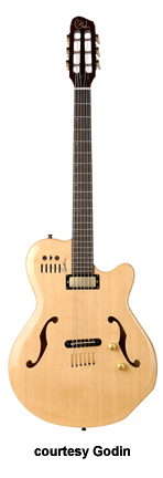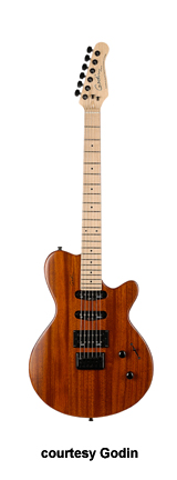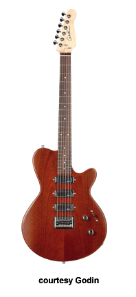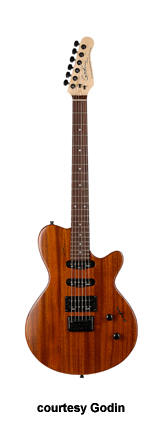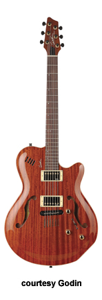 MONTREAL | - single cutaway chambered mahogany body, f-holes, mahogany neck, rosewood fingerboard, two Godin humbucker pickups, LR Baggs transducer bridge, custom pre-amp and three-band EQ, three knobs, five-way switch, black hardware, available in Natural finish, 24.75 in. scale, mfg. 2004-present. |