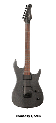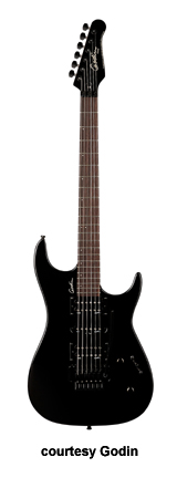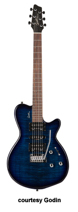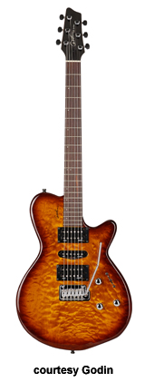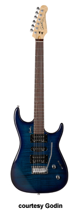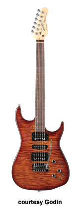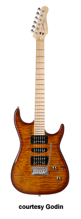 VELOCITY | - offset double cutaway Strat-style silver leaf maple body with poplar wings, rock maple neck, 22-fret maple fingerboard with offset black dots or rosewood fingerboard with offset white dots, Strat-style with six-on-one-side tuners, tremolo bridge, two Godin GS-1 single coils and one Seymour Duncan Custom SH-5 exposed humbucker pickups HSS, two knobs (v, tone), five-way pickup switch, High Definition Revoicer (HDR), gold hardware, available in Amber Flame, Natural Burst Flame, or Natural Flame finish, 25.5 in. scale, gig bag included, new 2008. |