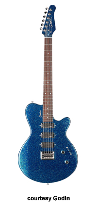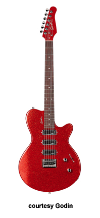 TRIUMPH | - single cutaway mahogany (Natural finish only) or silver leaf maple with poplar wings, 12 in. radius rock maple neck, 22-fret rosewood fingerboard with dot inlay, matching headstock with six-on-one-side tuners, fixed bridge, three Godin low noise single coil pickups, two knobs (v, tone), five-way switch, chrome hardware, available in Black (new 2008), Natural, Sparkle Blue, Sparkle Red, or Sparkle Silver finish, 24.75 in. scale, mfg. 2006-present. |