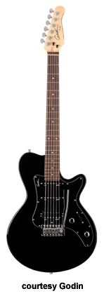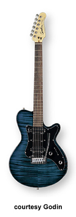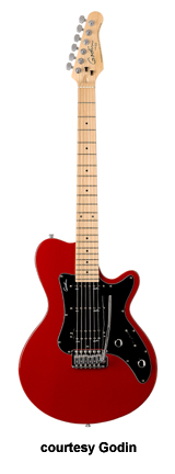 SDXT | - single cutaway silver leaf maple body with poplar wings, 25.5 in. scale, 12 in. radius rock maple neck, maple or rosewood fingerboard, 3 Godin designed pickups in HSH configuration, floating tremolo bridge, black pickguard, 2 knobs, 5-way switch, chrome hardware, available in Black Pearl, Red, or Midnight Blue finishes, disc. 2004. |