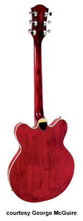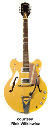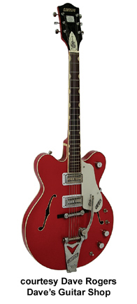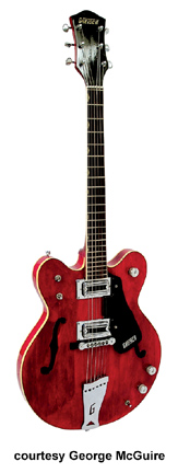 MONKEES' ROCK-N-ROLL MODEL MODEL 6123 | - double round cutaway bound maple body, arched top, two bound f-holes, maple neck, 22-fret bound rosewood fingerboard with pearl double thumbnail inlay, blackface peghead with pearl logo inlay, peghead mounted nameplate and three-per-side tuners, adj. bridge, Bigsby vibrato tailpiece, raised white pickguard with Monkees and Gretsch logos, two Super'Tron pickups, two knobs on lower treble bout (v1, v2), one knob on upper treble bout (MV), three three-way switches on lower treble bout (two tone switches, one pickup swith), chrome hardware, available in Red finish, mfg. 1966-68. |