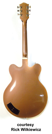 MODEL 6075/6076 12-STRING | - 12-string configuration, semi-hollow body, rosewood fingerboard with large triangular inlays, bound headstock with six-per-side tuners, adj. rosewood bridge, G cutout trapeze tailpiece, raised cream pickguard, two SuperTron pickups, control layout #3 (three knobs, three switches), chrome hardware, available in Natural (Model 6076) or Sunburst (Model 6075) finish, 16 in. body width (17 in. body width optional with padded back), mfg. 1967-1972 |