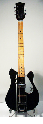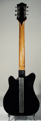 BIKINI MODEL 6023/6024/6025 | - double cutaway slide-and-lock poplar body with detachable poplar center block, available in six-string guitar (Model 6023), four-string bass (Model 6024), or double neck (Model 6025) configurations, bolt-on maple neck, 22-fret maple fingerboard with black dot inlay, blackface headstock with logo with various tuner configurations, adj. ebony bridge, trapeze tailpiece, raised white pickguard with logo, one Hi-Lo 'Tron pickup, volume/tone control, chrome hardware, available in Black finish, mfg. 1961-62. |