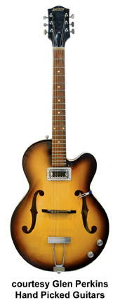 CLIPPER MODEL 6185/6186/6187/7555 | - single round cutaway maple body, arched top, two f-holes, double bound top and back, maple neck, 21-fret ebony fingerboard with white dot inlay, blackface peghead with logo, three-per-side tuners with plastic buttons, adj. ebony bridge, trapeze tailpiece, raised pickguard with logo, one or two exposed DeArmond pickups, volume/tone control, chrome hardware, available in Natural (Model 6187) or Sunburst (Model 6186/6185/7555) finish, 24.5 in. scale, mfg. 1958-1975. |
