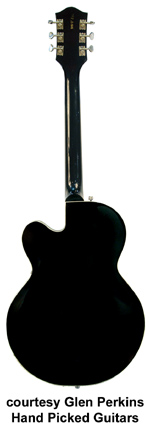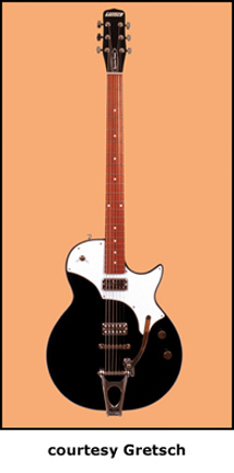 DUANE EDDY MODEL G6120DE | - single round cutaway bound body, arched laminated maple top, seven-ply laminated maple back and sides, two bound f-holes, rock maple neck, 22-fret bound ebony fingerboard with pearl hump block inlay, bound matching headstock with Gretsch logo and horseshoe inlays, Duane Eddy signature truss rod cover, and three-per-side Gotoh tuners, adj. Spacer Control bridge, chrome Bigsby vibrato tailpiece, raised pickguard with Duane Eddy's signature/logo, two Dynasonic single coil pickups, control layout #1, gold hardware, available in Ebony Burst (Model G6120 DE) or Orange (Model G6120 DEO) urethane finishes, 16.62 in. body width, 2.8 in. body depth, 24.6 in. scale, mfg. 1997-2002. |