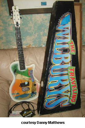 TRAVELING WILBURYS MODEL | - single cutaway solid body, bolt-on neck, 18-fret rosewood fingerboard with dot inlays, coke bottle-style white headstock, three-per-side tuners, adj. bridge/tailpiece, various pickup options and controls, chrome hardware, available in White finish with custom Traveling Wilburys graphics, Traveling Wilburys box included, made in Korea, mfg. 1988-1990. |