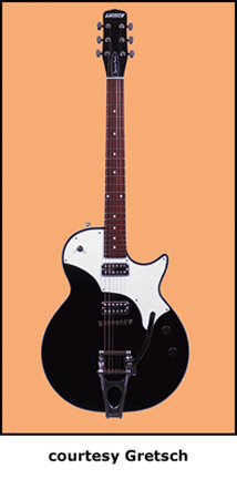 ROC JET MODEL 6127/6130/7610/7611/7612/7613 | - single cutaway mahogany body, arched bound top, mahogany neck, 22-fret bound ebony fingerboard with pearloid halfmoon inlay and zero fret, bound blackface headstock with "Roc Jet" logo, model nameplate, and three-per-side tuners, adj. bridge, "G" logo trapeze tailpiece, raised silver pickguard with Gretsch logo, two Super'Tron pickups, four knobs on lower treble bout (two v, two tone), one knob on upper treble bout (MV), three-way pickup switch on upper bass bout, chrome hardware, available in Mercedes Black (Model 6130/7610/7611), Porsche Pumpkin (Model 6127/7611, 1969-1975), Red (Model 7612, 1971-77), or Walnut-Stained Mahogany (Model 7613 (1971-1980), 13.5 in. body width, 1.5 in. body depth, 24.5 in. scale, mfg. 1969-1980. |