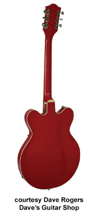DELUXE CHET MODEL 7680/7681 | - single round cutaway semi-hollow bound maple body, two bound f-holes, three-piece maple neck, 22-fret bound ebony fingerboard with pearl thumbnail inlay, tune-o-matic bridge, Bigsby vibrato tailpiece, bound black face headstock with pearl logo inlay and three-per-side tuners, raised black pickguard with model name/logo, two exposed pickups, four knobs on lower treble bout (two v, two tone), one knob on upper treble bout (MV), three-position switch on upper bass bout, chrome hardware, available in Dark Red (Model 7680) or Walnut (Model 7681) finish, 17 in. body width, 2.5 in. body depth, mfg. 1973-74. |