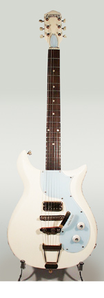 PRINCESS MODEL 6106 | - offset double cutaway mahogany body with beveled edges based on the solidbody Corvette, padded back, mahogany neck, 21-fret rosewood fingerboard with pearl dot inlay, Tone Twister vibrato, body matching peghead with logo, three-per-side tuners with plastic buttons, adj. bridge, trapeze tailpiece, pickguard with "Princess" logo, single HiLo'Tron pickup, two knobs (v, tone), gold hardware, available in Blue with white pickguard, Pink with white pickguard, or White with grape (purple) or gold pickguard finishes, 13.5 in. body width, 1.5 in. body depth, 24.375 in. scale, mfg. 1963 only. |