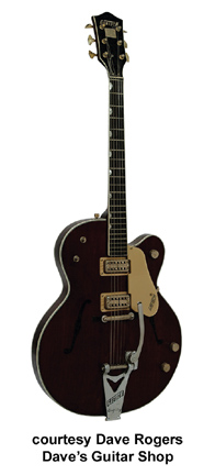TENNESSEE ROSE SPECIAL G6119SP (NO. 240-1305) | - similar to the Tennessee Rose, except is based on the late '50s models with a 2.5 in. deep body, two High Sensitive Filter'Tron pickups, Bigsby tailpiece, neo-classical dot markers, and a Gretsch rocking bar bridge, available in Deep Cherry Stain finish, mfg. 2004-06. |