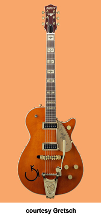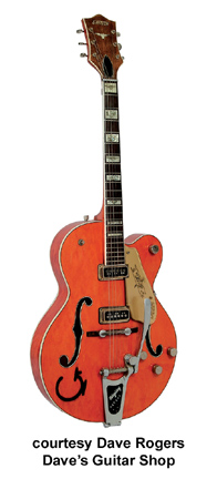 NASHVILLE REVEREND HORTON HEAT SIGNATURE G6120RHH (NO. 240-1217) | - patterned after the Nashville model, features aged fingerboard, headstock binding, wide block Pearloid inlays, and other western motifs, bound oversized f-holes, two TV Jones Classic pickups, three knobs, two switches, clear pickguard, Bigsby tailpiece, available in Orange finish, mfg. 2005-present. |