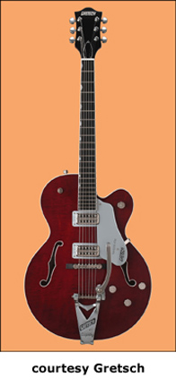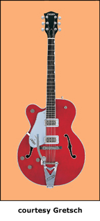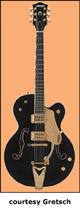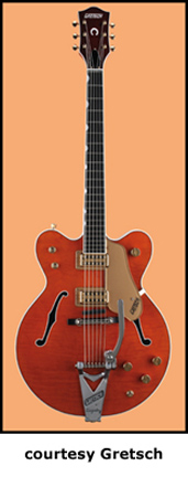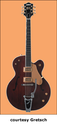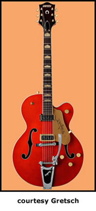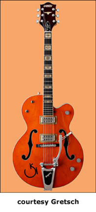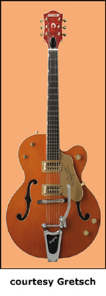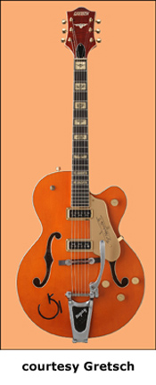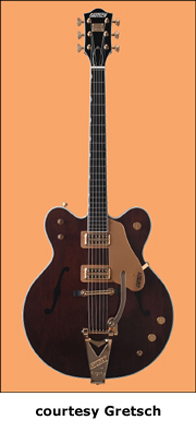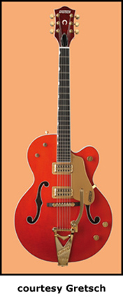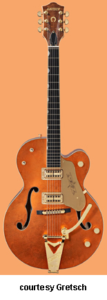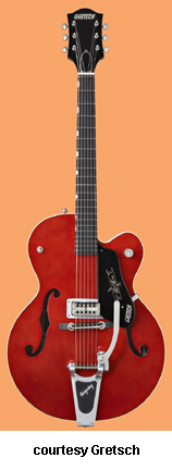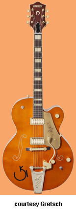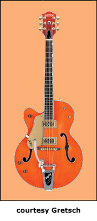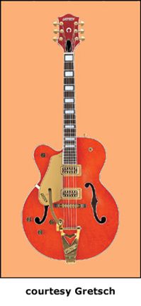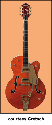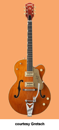 NASHVILLE/CHET ATKINS HOLLOW BODY MODEL G6120 (NO. 240-1230/1250) | - single round cutaway semi-hollow bound maple body, bound f-holes, three-piece maple neck, 22-fret bound ebony fingerboard with pearl block inlay, bound black headstock with pearl horseshoe/logo inlay and three-per-side tuners, adjustamatic metal bridge with ebony base, Bigsby vibrato tailpiece, raised gold pickguard with logo, two humbucker pickups, three knobs (v1, v2, MV), two three-way switches (pickup, tone), gold hardware, available in Black (Model G6120BK), Trans. Orange (Model G6120) or Blue Sunburst (Model G6120 BS) finish, mfg. 1991-present. |