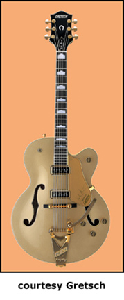 NASHVILLE GOLDEN ANNIVERSARY MODEL G6120GA (NO. 240-1214) | - Nashville style, single cutaway hollow body, arched laminated maple top, laminated maple back and sides, two oversized f-holes, body binding, three-piece maple neck, 22-fret bound ebony fingerboard with thumbnail inlays, bound black headstock with horseshoe inlay and three-per-side tuners, ebony-based roller bridge, Bigsby vibrato tailpiece, raised gold plexi pickguard, two TV Jones classic pickups, three knobs (v1, v2, MV), two three-way switches (pickup, tone), gold hardware, available in Metallic Gold finish, 24.6 in. scale, mfg. 2004-06. |