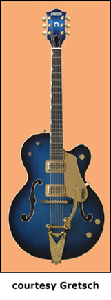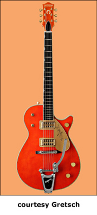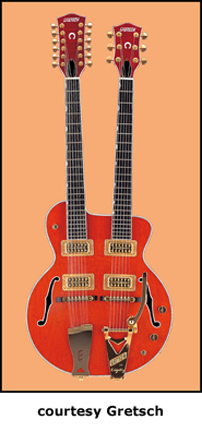Nashville Doubleneck Model G6120-6/12 (No. 240-1309) | - similar to the Nashville, except has two necks (six-string and 12-string) with controls and pickups for each neck, and a Bigsby on the six-string, available in Orange Stain finish, mfg. 1997-2007. |