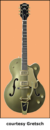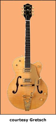 NASHVILLE/CHET ATKINS HOLLOW BODY WESTERN U.S. CUSTOM SHOP G6120WCST (NO. 240-1216/1254) | - Nashville style, DynaSonic pickups, Bigsby tailpiece, mfg. in the U.S. Gretsch Custom Shop, available in Western Maple Stain finish, mfg. 2004-present. |