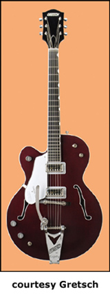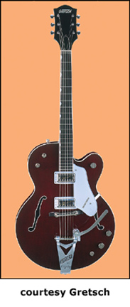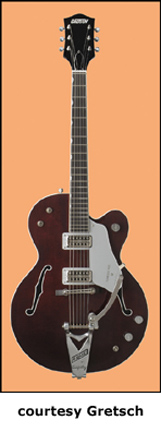 TENNESSEE ROSE/CHET ATKINS TENNESSEE ROSE 1962 MODEL G6119-1962FT/HT (NO. 240-1302/1303/1313/1314) | - single cutaway hollow body based on the 1962 Chet Atkins Tennessean, arched laminated maple top, laminated maple back and sides, two bound simulated f-holes, multiple body bindings, three-piece maple neck, 22-fret plus zero fret rosewood fingerboard with thumbnail inlays, black headstock overlay with Gretsch logo and three-per-side tuners, ebony-based Rocking bar bridge, Gretsch Bigsby tailpiece, raised silver plexi pickguard, two Filter'Tron (Model 1962FT) or two HiLo'Tron (Model 1962HT) pickups, two knobs on lower treble bout (v1, v2), one knob on upper treble bout (MV), two three-way switches on upper bass bout (tone selector, pickup selector), standby switch, chrome hardware, available in Walnut Stain with Filter'Tron pickups and Burgundy Stain with HiLo'Tron pickups, 16 in. body width, 2 in. body depth, 24.6 in. scale, mfg. 1994-present. |