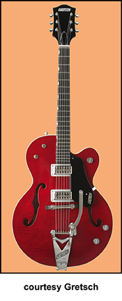 TENNESSEE ROSE/CHET ATKINS TENNESSEE ROSE MODEL G6119 (NO. 240-1301/1312) | - single round cutaway semi-hollow bound maple body, bound f-holes, maple neck, 22-fret bound rosewood fingerboard with pearl thumbnail inlay, black face headstock with pearl logo inlay and three-per-side tuners, ebony/metal tune-o-matic bridge, Bigsby vibrato tailpiece, raised silver pickguard with model name/logo, two humbucker pickups, three knobs (v1, v2, MV), two three-way switches (pickup, tone), chrome hardware, available in Dark Cherry Red Stain finish, current mfg. |
