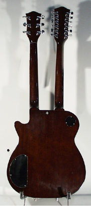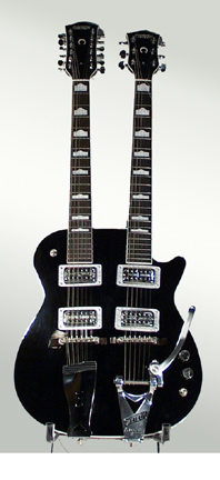 Duo-Jet Doubleneck Model G6128T-6/12 (No. 240-0409) | - Similar to the Duo Jet Reissue Model G6128, except in doubleneck configuration (one six-string, one 12-string) with pickups and controls for each neck, and a Bigsby tailpiece on the six-string, 17 in. body width, mfg. 1998-2007. |