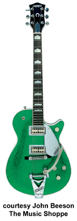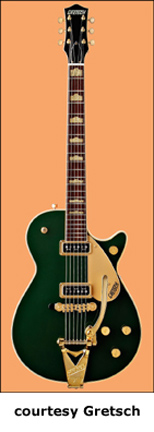 Duo Jet Reissue Bigsby Cadillac Green Model G6128TCG (No. 240-0408) | - similar to the Duo Jet Reissue, except has a Bigsby tailpiece, a Synchro-Sonic bridge, Dynasonic pickups, pearl humptop fingerboard inlays, control layout #2, and gold hardware, available in Cadillac Green finish, mfg. 2005-present. |