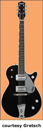 DUO JET REISSUE MODEL G6128 (NO. 241-0400) | - single round cutaway mahogany body, mulitple-bound arched maple top, one-piece mahogany neck, 22-fret bound rosewood fingerboard with pearl humpblock inlay, adjustamatic bridge, G logo trapeze tailpiece, bound blackface headstock with pearl horseshoe/logo inlay, and three-per-side tuners, raised white pickguard with logo, two Filter'Tron pickups, control layout #2, chrome hardware, available in Jet Black top finish, 13.25 in. body width, 1.75 in. body depth, 24.6 in. scale, mfg. 1990-present. |