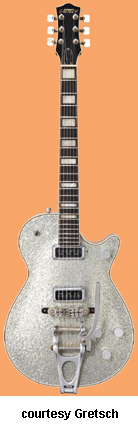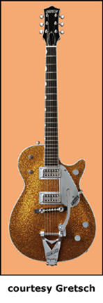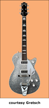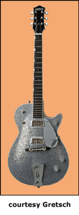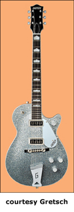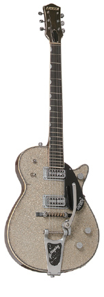 SPARKLE JET MODEL G6129TX (NO. 240-0405) | - single round cutaway mahogany body, bound arched maple top, mahogany neck, 22-fret bound ebony or rosewood fingerboard with pearl humpblock inlay, bound blackface peghead with pearl horseshoe/logo inlay, three-per-side tuners, ebony-based Space Control Roller Bridge, Bigsby vibrato tailpiece, raised silver plexi pickguard with Gretsch logo, two Filter'Tron pickups, control layout #2 (three knobs, two switches), chrome hardware, available in Black Sparkle (G6129TB, disc. 2002), Champagne Sparkle (G6129TC, disc. 2003), Green Sparkle (G6129TG), Gold Sparkle (G6129TAU), Light Blue Pearl Sparkle (G6129TL), or Red Sparkle (G6129TR, disc. 2003) top finish, mfg. 1994-present. |