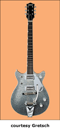 SILVER JET 1962 REISSUE BIGSBY MODEL G6129T-1962 (NO. 240-0407) | - double asymmetrical rounded cutaway mahogany body based on the 1962 Silver Jet, bound arched laminated maple top, mahogany neck, 22-fret bound ebony fingerboard with thumbnail inlays, bound blackface peghead with pearl Gretsch logo inlay and three-per-side tuners, ebony-based Space Control Roller-Bridge, Gretsch Bigsby vibrato tailpiece, raised silver plexi pickguard with Gretsch logo, two Filter'Tron pickups, control layout #2 (three knobs, two switches), chrome hardware, available in Silver Sparkle finish, 13.25 in. body width, 1.5 in. body depth, 24.6 in. scale, mfg. 1996-present. |