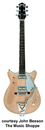 Sparkle Jet 1962 Reissue Bigsby Model G6129T-1962 (No. 240-0407) | - similar to the Sparkle Jet Reissue, except has features and specifications of the 1962 model, available in Champaign Sparkle finish, disc. 2003. |