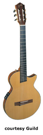 PALOMA (NO. 360-6200) | - chambered special design solid mahogany body and solid spruce top, ebony fingerboard, Chesterfield logo, side dots, classical style neck and headstock, high volume nylon electric with custom design pickup Fishman system, available in Amber or Black finish, built by the Guild Custom Shop in Nashville, TN, disc. 2005. |