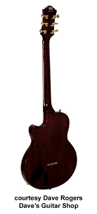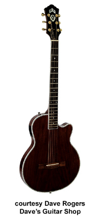 PEREGRINE (NO. 360-6000) | - chambered special design solid mahogany body and top, rosewood fingerboard, Chesterfield logo, pearl dot inlay, high volume acoustic electric with custom design pickup Fishman system, available in Black, Lake Placid Blue, or Red Trans. finish, built by the Guild Custom Shop in Nashville, TN, mfg. 2003-05. |