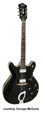 STARFIRE V | - similar to Starfire IV, except has pearl block fingerboard inlay, Guild Bigsby vibrato, master volume control, available in Cherry Red, Ebony, Emerald Green, or Honey Amber finishes, mfg. 1963-1972. |