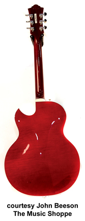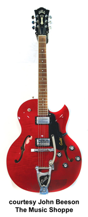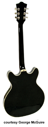 STARFIRE VI | - similar to Starfire IV, except has bound f-holes, ebony fingerboard with pearl block/abalone wedge inlay, Guild Bigsby vibrato, bound peghead with pearl shield/logo inlay, gold hardware, master volume control, available in Cherry Red, Ebony, Emerald Green, or Honey Amber finishes, mfg. 1963-1979. |