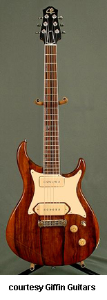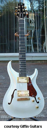 GIFFIN GUITARS | Instruments currently produced in Portland, OR, since 2004. Previously produced in San Fernando Valley, CA from 1988-2004, and in England from the late 1960s-1988. | Luthier Roger Giffin has been building custom guitars and basses since the late 1960s. He ran a guitar shop that built and repaired guitars in London, England. In the late 1970s, he designed a guitar that would later become the Steinberger M Series. Gibson took interest in the guitar and Giffin was offered a job at the West Coast Gibson Custom Shop. He moved to Los Angeles, CA in 1988, and worked there until all custom shop material was moved to Nashville in 1993. In 1994, Brett Allen and Giffin started the R & B Instrument Service in L.A., where they mainly did repairs. In 1997, Giffin decided to branch out on his own again and started building guitars. He produced guitars in L.A. until June, 2004, when he relocated to Portland, OR. Giffin builds guitars under the philosophy that a hands-on approach to guitar building allows himself to build unique and individual instruments. The very highest standard of hand building instruments is used. For more information or for ordering, contact Giffin directly (see Trademark Index).