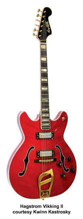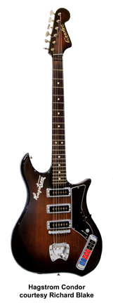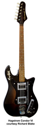 HAGSTROM | ELECTRIC: 1950S-1980S MFG | Some Hagstrom models encountered at guitar shops and shows include the 1959 Les Paul-styled ESP 24 hollowbody and four pickup EDP 46 De Luxe. These have all wood hollowbody interior construction with plastic exterior and were available in sparkle, pearloid or plain with a white pearloid "mother of toilet seat" fingerboard. Some of the more frequently seen models are the Kent I and H I, equipped with two single coil pickups and 4 control slide switches. These had a complete Lucite molded top and vinyl back. The H II and H III models are easy to identify because the name is on the headstock, and the number of pickups corresponds with the model number. (it is important to note that original parts for these guitars, especially the switches, are very difficult to find). Later came the H II N which had two humbucker pickups. The Viking I is equipped with two single coil pickups, one selector switch, individual tone and volume controls for each pickup and six-in-line tuners. As the Viking line is a semi-hollowbody, these have more of a 335 vibe to them. The Viking II is similar to the V I , except it has gold hardware and accents. (this is sometimes called the "Elvis guitar" as Elvis briefly played one in his '68 comeback) The Viking I N (or Scandia) was equipped with two humbucker pickups, D'Aquisto-designed three-on-one-side tuners, separate volume and tone controls, pickup selector and a tone selector. It has a plain badge on the headstock. The Viking looks identical to the V I N except it has a floral headstock badge and a wood center block in the thinline hollowbody. 1963 brought out one of Hagstrom's more unusual desings with the introduction of the Impala and Corvette. Shaped much like the Fender Jaguar, the necks were contoured and filled so they blended and flowed directly into the body. When the guitars began being imported into the U.S., the Corvette name had to be changed to Condor, as Gretsch already had the Corvette name registered. Hagstrom's Swede, a Les Paul-derived solidbody electric, was introduced in 1970. The suggested list price for the Swede (Model 803) in 1975 was $640. In 1977, the Super Swede made its debut. 1977 brought about the Scandi, a three single coil Strat-ish style. Most Hagstrom models had a corresponding bass available. In 1969, Hagstrom debuted an f-hole archtop model designed by James D'Aquisto. The body was made of nine-ply laminate birch, these guitars were actually produced by Bjarton of Bjarnum, Sweden for Hagstrom. In 1976, Hagstrom manufactured and reintroduced the Jimmy model and in 1977 added the oval hole model. D'Aquisto did not make these guitars for Hagstrom. However he did purchase bodies from Hagstrom and used them in his own line of hollowbody electrics. Hagstrom and Ampeg teamed up and introduced the Patch 2000 guitar and synthesizer system in 1976. This system of a modified Swede model plus a footpedal had a list price of $2,000 in 1977. Due to the wiring design, it is advisable that you purchase both at the same time if the intention is to use it with a synthesizer. However the instrument plays as any other without the pedal. It should be noted that the values decrease significantly when the conditions are 80% or less, as replacement parts for Hagstrom guitars and basses are very difficult to find. The publisher would like to thank Mr. Kwinn Kastrosky for his significant contributions to the Hagstrom section. | CORVETTE CONDOR | - 3 single coil pickups, otherwise identical to the Impala. |
