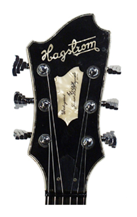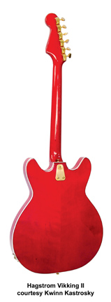 HAGSTROM "JIMMY" D'AQUISTO | - single cutaway w/ f-holes, laminate birch ached top and back, adjustable ebony saddle and bridge base, 2 humbucker pickups, 2 volume/2 tone contols, 3-position pickup selector, 20-fret birch neck with ebony fretboard, block inlay, 24.75 in. scale, body length 20 in., width 15.75 in., depth 2.75 in. |