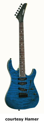CALIFORNIAN QUILT SSS (MODEL CX4Q) | - similar to the CX2 Californian, except has a quilted maple top, a rosewood fingerboard, a tremolo unit, and three single coil pickups, available in Trans. Red, Trans. Violet, or Trans. Blue finish, mfg. 2003-06. |