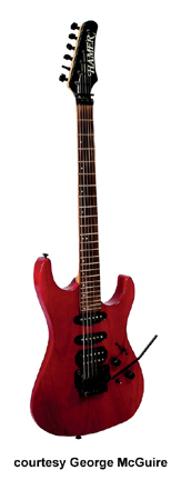 SLAMMER CENTAURA (MODEL CTM) | - similar to the Centaura, except has maple fingerboard, standard vibrato, reverse headstock, available in Black, Blood Red, Candy Apple Red, 3 Tone Sunburst, or Vintage White finishes, disc. 1996. |