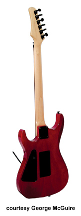 CENTAURA (MODEL GCTS) | - offset double cutaway alder body, bolt-on maple neck, 24-fret rosewood fingerboard with pearl offset inlay, Floyd Rose tremolo, reverse headstock, 6-on-a-side Schaller tuners, black hardware, 2 single coil/humbucker Seymour Duncan pickups, volume/tone control, 5-position switch, upper mids boost switch, available in Aztec Gold, Black, Emerald Green, or Trans. Cherry finishes, mfg. 1988-1993. |