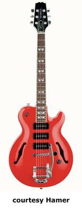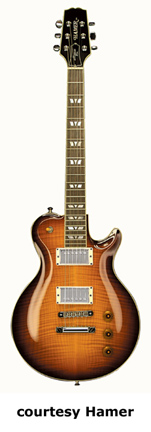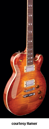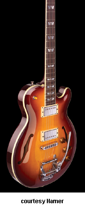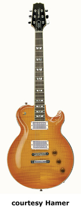 MONACO ELITE (MODEL MONEL) | - similar to the Monaco except has a solid body with a flamed maple top, no f-holes, a tune-o-matic bridge, and a stop tailpiece, available in '59 Burst, Aztec Gold, Black (disc.), Black Trans., Indigo Blue, or Tobacco Sunburst finish, mfg. 2003-present. |