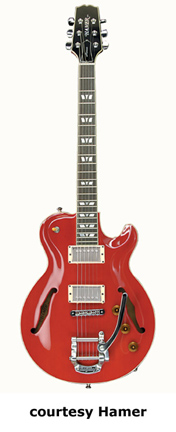MONACO (MODEL MON) | - single cutaway hollow mahogany body, spruce arched top with f-holes, mahogany neck, 22-fret rosewood fingerboard with victory inlays, three-per-side-tuners, dovetail neck joint, two Seymour Duncan humbucking pickups, three knobs (v, v, tone), three-way switch, tune-o-matic bridge, Bigsby Vibrato, Schaller tuners, chrome hardware, available in Jazzburst (new 2008) or Red Trans. finish, mfg. 2003-present. |
