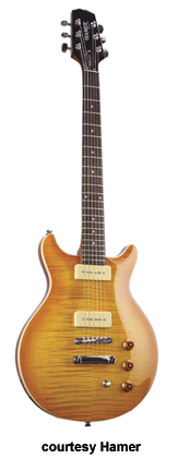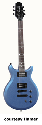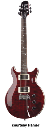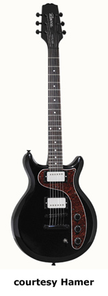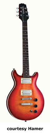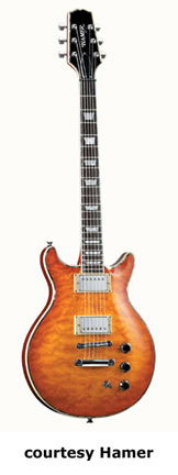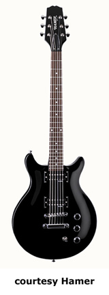SUNBURST ARCHTOP 2 (MODEL SAT2, XT SERIES) | - symmetrical double cutaway mahogany body, arched top, set mahogany neck, 22-fret rosewood fingerboard with dot inlays, black headstock with three-per-side tuners, tune-o-matic bridge, stop tailpiece, two exposed Hamer humbucker pickups, three knobs (v, v, tone), three-way switch, chrome hardware, available in Black finish, current mfg. |