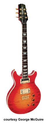 SUNBURST ARCHTOP CUSTOM (MODEL SBCS) | - double cutaway mahogany body, arched bound figured maple top, mahogany neck, 22-fret bound rosewood fingerboard with abalone crown inlay, tune-o-matic bridge/stop tailpiece, 3-per-side tuners, gold hardware, 2 Seymour Duncan humbucker pickups, 2 volume/1 tone controls, 3-position switch, available in '59 Burst, Aztec Gold, Blue Burst, Emerald Green, Natural, Salmon Blush, Trans. Blue, Trans. Cherry, or Vintage Orange finishes, mfg. 1991-95. |