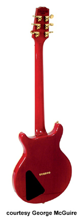 SUNBURST ARCHTOP (MODEL SAT) | - slightly offset double cutaway mahogany body, bound carved maple top, mahogany neck, 22-fret rosewood fingerboard with dot inlay, tune-o-matic bridge/stop tailpiece, 3-per-side tuners, chrome hardware, 2 Duncan Designed exposed pole piece humbucker pickups, volume/2 tone controls, 3-position switch, available in Black (BK), Gold Top (GT), and Vintage White finishes, disc. 1999. |