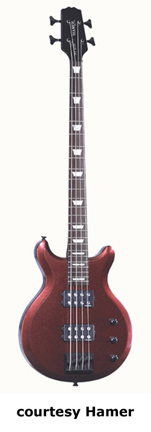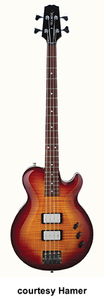 MONACO BASS (MODEL MONB) | - single cutaway chambered mahogany body with a figured maple top, maple neck, 21-fret rosewood fingerboard with dot inlay, two-per-side tuners, two Seymour Duncan Phat Cat bass pickups, three knobs, chrome hardware, available in '59 Burst or Tobacco Sunburst finish, mfg. 2005-present. |
