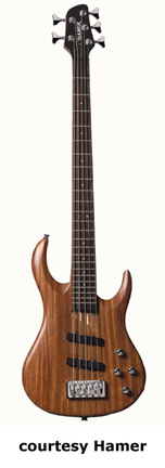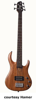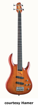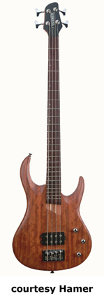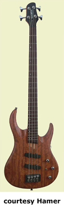 HAMER | ELECTRIC BASS: VELOCITY SERIES | | VELOCITY (MODEL VEL) | - double offset cutaway bubinga body, 5-piece maple/bubinga neck, 24-fret rosewood fingerboard with dot inlays, single humbucker pickup, active electronics, 3 knobs (v, b, t), Gotoh style bridge, 2-per-side-tuners, chrome hardware, available in Natural Oil finish, mfg. 2003-04. |