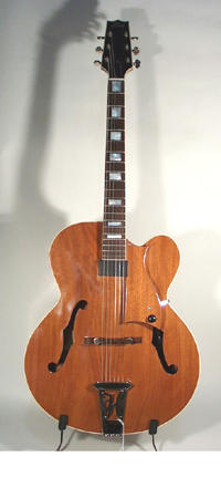 EAGLE | - single round cutaway hollow style, solid mahogany top/pickguard, f-holes, cream-bound body, mahogany back/sides/neck, 20-fret rosewood fingerboard with pearl dot inlay, three-per-side tuners, rosewood bridge, trapeze tailpiece, pickguard-mounted Heritage jazz pickup, volume control on pickguard, chrome hardware, available in standard finish, 17 in. body width, 3 in. body thickness, 25.5 in. scale, mfg. 1986-2007. |