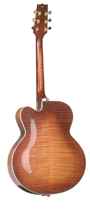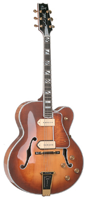 SUPER EAGLE | - single round cutaway hollow style, solid spruce carved top, bound body and f-holes, bound maple pickguard, curly maple back/sides/neck, 20-fret bound ebony fingerboard with pearl split block inlay, bound peghead with pearl eagle on tree and logo inlay, pearl truss rod cover with owner's name, three-per-side Grover Imperial tuners, ebony bridge with pearl V inlay, trapeze tailpiece, single floating or two humbucker pickups, volume/tone controls and three-position switch, gold hardware, available in Antique Sunburst finish, 18 in. body width, 3 in. body thickness, 25.5 in. scale, mfg. 1988-present. |