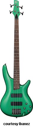SR300 SECOND VERSION | - offset double cutaway agathis body, bolt-on five-piece maple/rosewood neck, 24-fret rosewood fingerboard with pearl dot inlays, matching finish headstock overlay, two-per-side tuners, B100 bridge, two Ibanez EXF, Style Sweeper 3-band active electronics, four knobs, black chrome hardware, available in Green Sparkle (new 2009), Iron Pewter, Red Sparkle (new 2009), Roadster Orange Metallic, or Starlight Blue finish, mfg. 2008-present. |