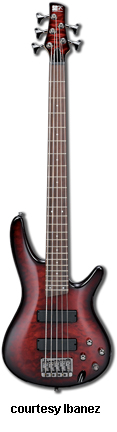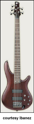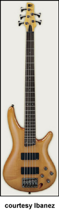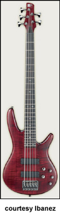 IBANEZ | ELECTRIC BASS: SOUNDGEAR (SR) SERIES | Soundgear Series basses were introduced in 1987, and feature the SD GR by Ibanez logo on their headstocks. In 1998, Natural and Jewel Blue finishes were introduced; Blue Night and Metallic Green finishes were discontinued. | SR05 FIVE-STRING | - offset double cutaway light ash body, bolt-on three-piece maple neck, 24-fret rosewood fingerboard with dot inlay, matching headstock with 3/2-per-side tuners, HB-5 bridge, two Lo-Z combination pickups (one straight, one angled), four knobs, black hardware, available in Fountain Red or Jewel Blue finish, mfg. 1988-89. |